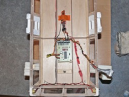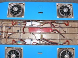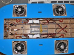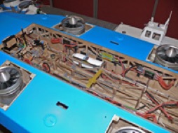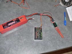 - Les contrôleurs des moteurs sont programmés correctement, nombre d’éléments des LiPos, frein, démarrage, fréquences, etc… avant leur installation sur l’engin.  On peut alors essayer de positionner tous les éléments dans la coque. Ça fait un paquet de contrôleurs et donc de fils…