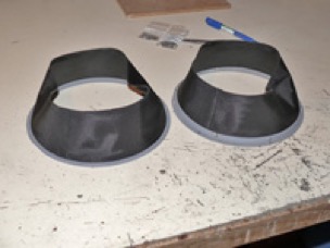 - La première étape est de coller la jupe sur la couronne. La partie de la couronne recevant la jupe est elle même conique. Il faut veiller à bien la coller juste en appui sur la base pour avoir une hauteur finale aussi régulière que possible. J’ai utilisé la même colle que pour la fabrication des jupes : Seamgrip/Cotol. Assez facile à maintenir en place durant la prise (plusieurs heures), des pinces pouvant être mises par le haut.