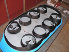 - Le problème est de maintenir correctement la jupe sur la base durant le temps de prise de la colle. C’est un cône sur un cône. Un petit casse-tête... Je ne voulais pas utiliser d’épingles ou agrafes qui, enfoncées brutalement dans la fine couronne en CTP 8/10ème de la base, risquaient de l’endommager. Pas de prises de risques à ce stade du projet!