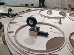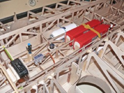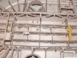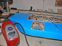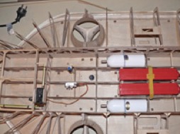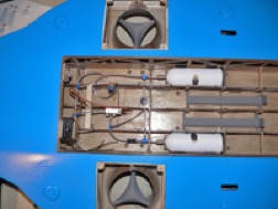 - Il faut installer dans la coque les bonbonnes d’air, le clapet de remplissage, l’électrovanne et le mano de contrôle (Les emplacements des accus, proches du centre de gravité, sont laissés libres). Puis planifier l’installation des durites et fixer les trains sous la coque.